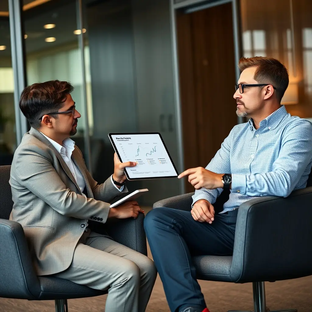 A coach and an AI assistant working together, the coach is reviewing insights provided by the AI on a tablet, in a modern office setting.